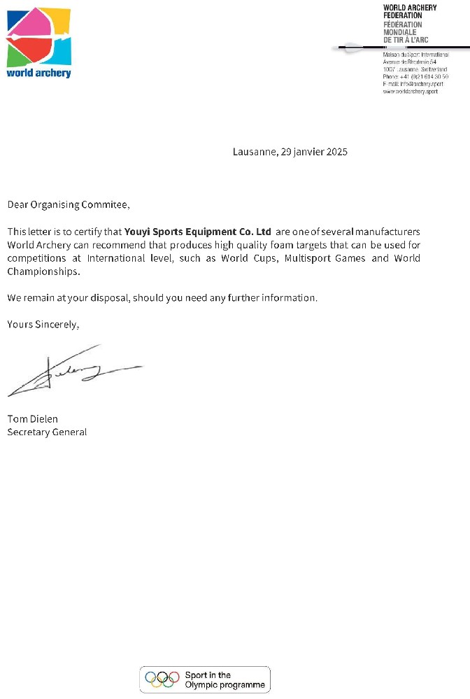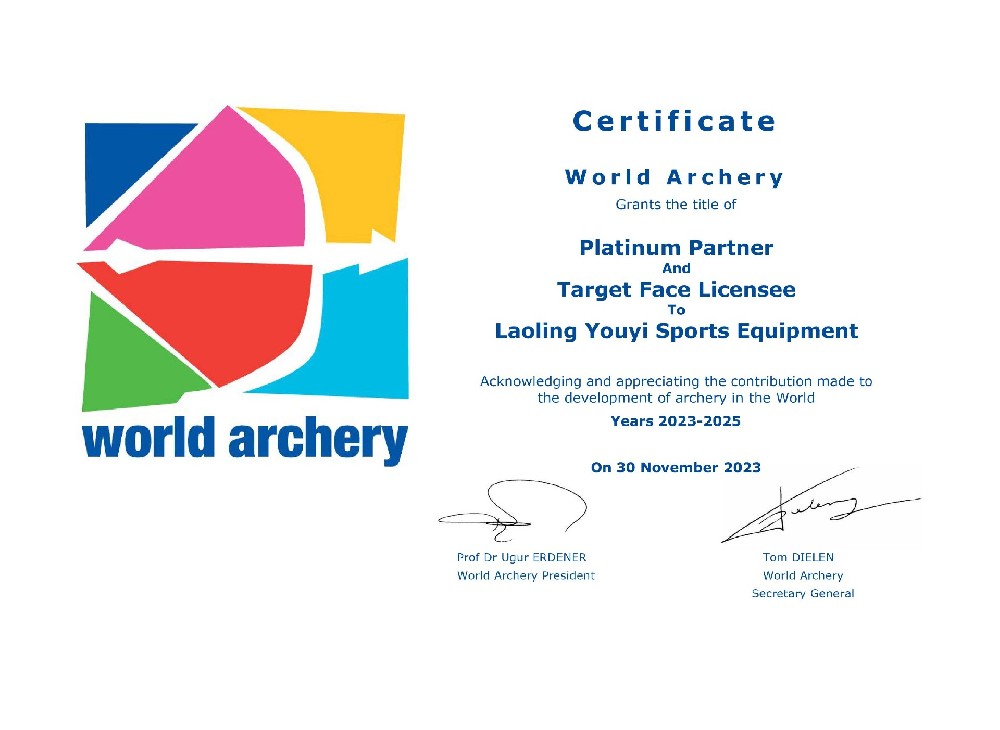 目前,主要生產(chǎn)和銷售射箭比賽及訓(xùn)練專用器材,包括:箭靶、靶紙、靶架、號碼牌、風(fēng)向旗、計時記分器等場地器材設(shè)備;反曲弓、復(fù)合弓、傳統(tǒng)弓、瞄準(zhǔn)器、防震桿等弓箭裝備;箭壺、護(hù)胸、護(hù)臂、護(hù)指等各類箱包護(hù)具。公司所生產(chǎn)的射箭器材已通過國際射箭聯(lián)合會及中國射箭協(xié)會CAA認(rèn)證。